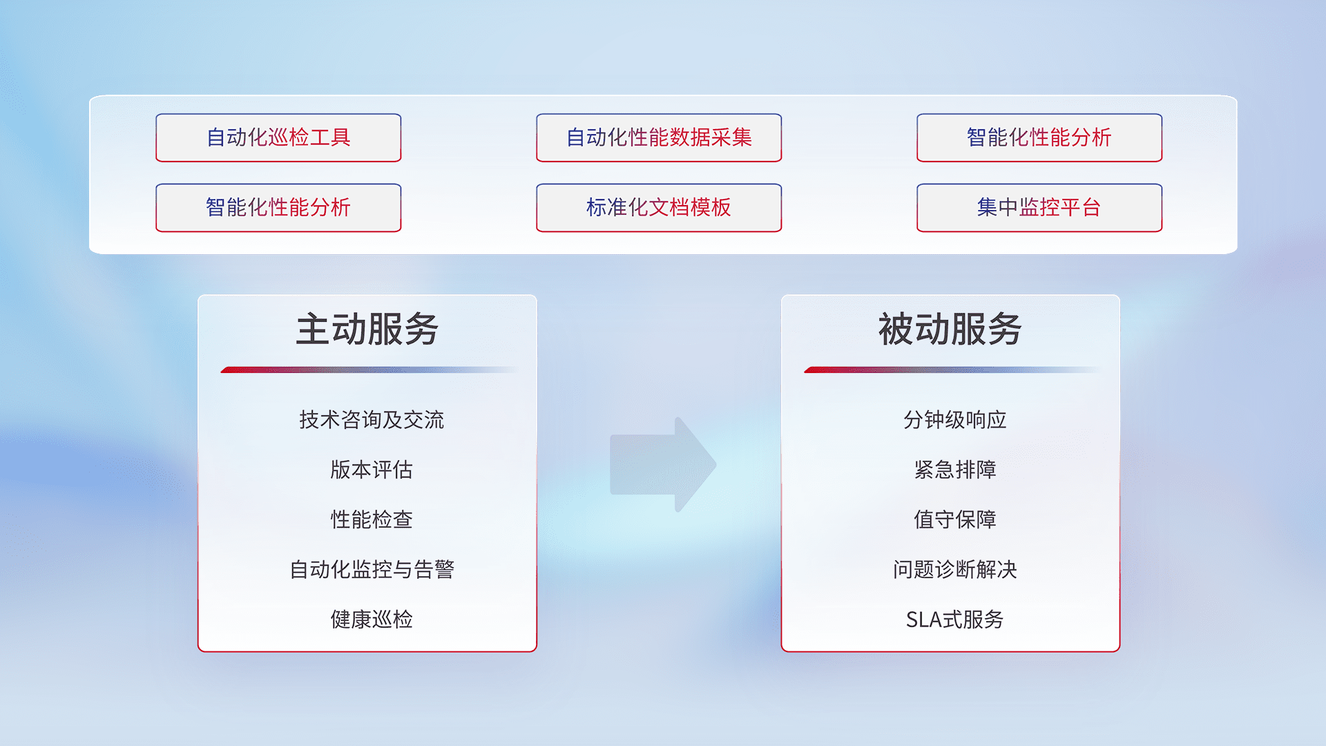 智能化工具和标准化文档,,,保障服务质量,,,,提供主动服务(包含技术咨询、、版本评估、、性能检查、、自动化监控与告警、、、、健康巡检)和被动服务包含(分钟级响应、、、紧急排障、、、、值守保障、、问题诊断解决、、、、SLA服务)。。。。