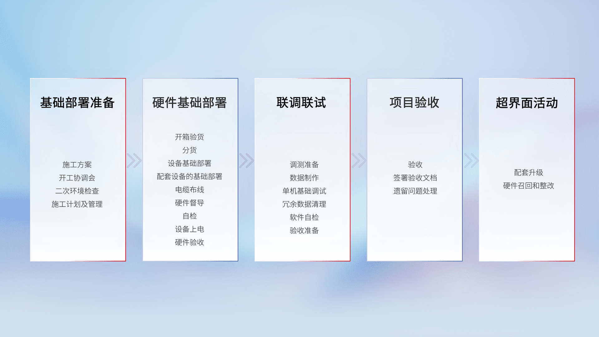 从基础部署准备、、、硬件基础部署、、联调联试、、项目验收、、、、越界面活动的全过程可追溯,,,,保证施工质量和进度。。